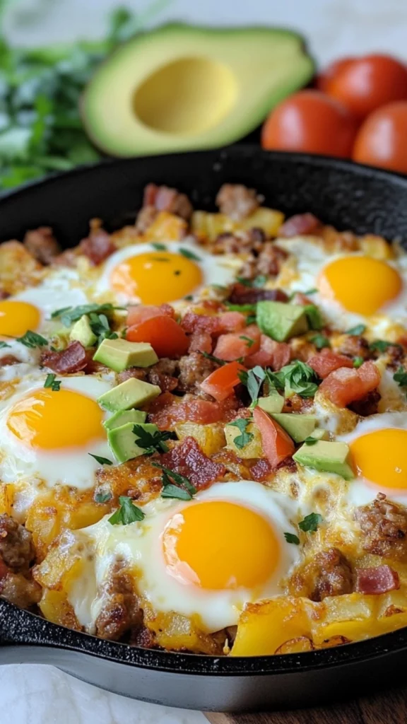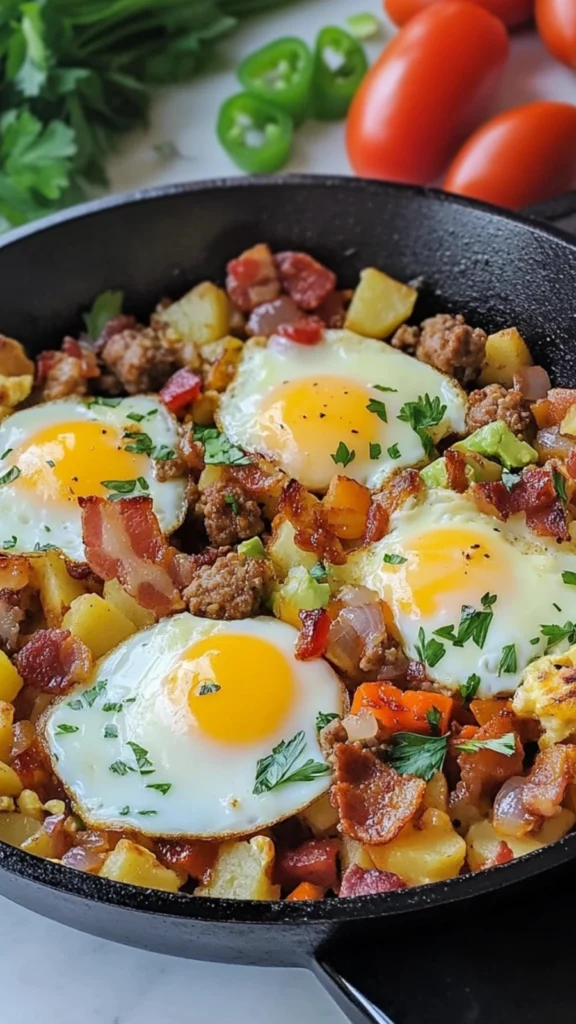 Serve: Serve the Breakfast Skillet immediately with your choice of toppings, such as sliced green onions, tomatoes, avocado, jalapeños, parsley, sour cream, Greek yogurt, and hot sauce. Toppings add flavor, texture, and visual appeal to the breakfast.