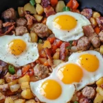 Weekends were made for lazy mornings and, of course, delicious breakfasts. But who says you have to spend hours in the kitchen to create a truly satisfying morning meal? This Simple Loaded Breakfast Skillet is the answer to your breakfast prayers – a one-pan wonder packed with potatoes, bacon, sausage, eggs, cheese, and your favorite veggies. It’s a hearty, flavorful, and incredibly easy way to fuel your day, perfect for a weekend brunch or even a quick and satisfying weekday breakfast. I remember the first time I made a breakfast skillet. I was trying to impress some friends with a “gourmet” brunch, but I was also running late and panicking about the mess I was making. Pots and pans were piling up, and I was starting to regret my ambitious menu. Then I realized I could just throw everything into one pan! It was a game-changer. The cleanup was minimal, the food was delicious, and everyone was impressed.