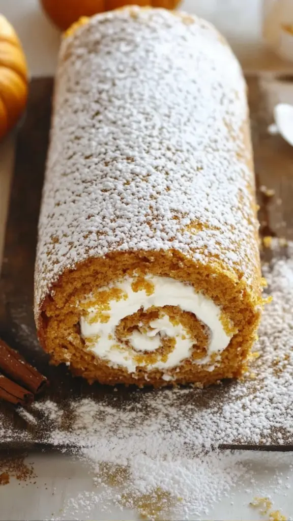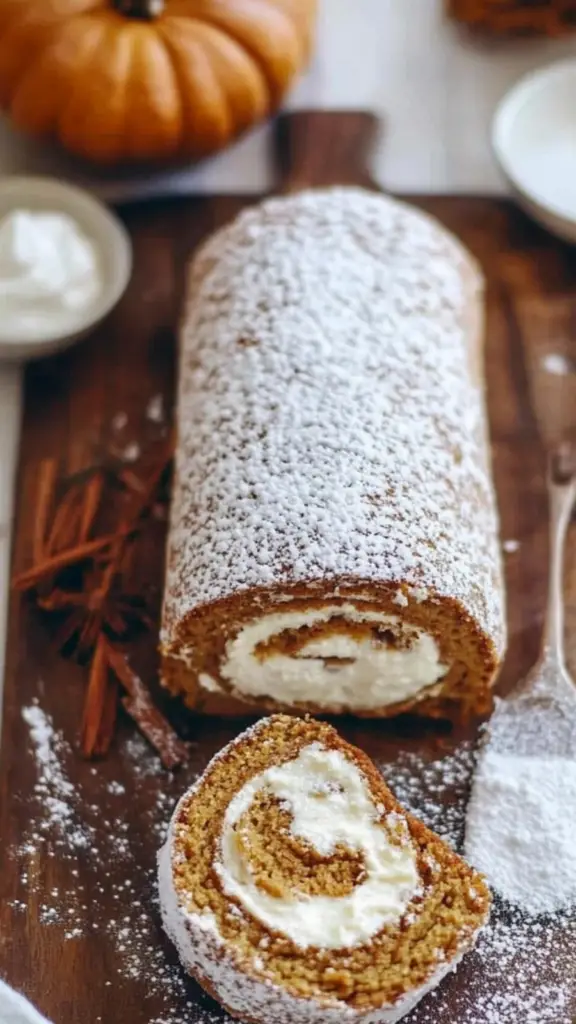 Before serving, dust the pumpkin roll with powdered sugar for an added touch of sweetness and visual appeal. The powdered sugar will contrast beautifully with the rich orange color of the cake, making it look even more festive and inviting.