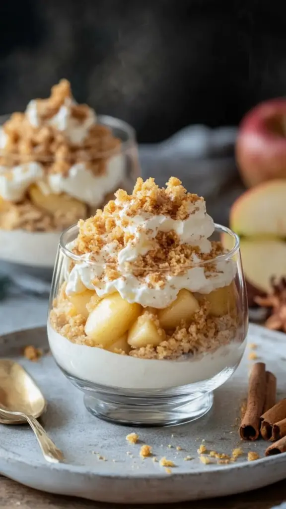 This dessert is versatile and can be served in a variety of ways. For a more decadent treat, top each serving with a dollop of whipped cream or a scoop of vanilla ice cream. A drizzle of caramel sauce or a sprinkle of toasted almonds can also add an extra layer of flavor and elegance. For a more festive twist, you can add a small pinch of nutmeg or allspice to the apple compote or the cinnamon cream for added warmth. Serve this dessert at a dinner party, a fall gathering, or as a special treat for yourself and loved ones. Its balance of creamy, fruity, and crunchy elements makes it the perfect dessert to enjoy with a hot cup of tea or coffee.